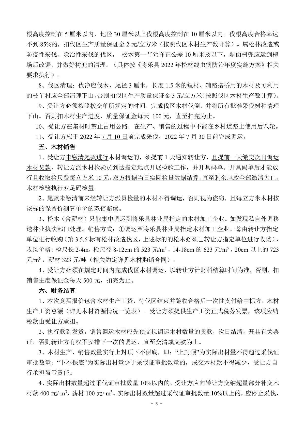 重要信息披露 | 1、標的簡介所列的出材量等數據僅供參考,標的以現狀交付,轉讓方及交易中心不承擔標的面積與實測面積、標的出材量與實際出材量差異等責任,不調整相應的成交價格。 2、本次競買報價包含木材生產工資,木材生產工資總額詳見木材資源情況一覽表,待伐區結束并驗收后一次性支付給受讓方。 3、銷售費用、成交后發生的政策變化費用、稅收均由受讓方承擔。 4、松木(含薪材)只能集中調運到將樂縣林業局指定的木材加工企業。如發現私自外調的,將移送林業執法部門處理。銷售方式:①調運至將樂縣林業局指定木材加工企業。②由轉讓方指定單位進行收購(第3.5.6標中有松木改造伐區,上述標的的松木必須由轉讓方指定單位進行收購)(相關約定詳見木材購銷合同)。 5、受讓方應于2022年7月10日前完成采伐,2022年7月30日前完成調運。 6、本次交易第1標和第2標木材運輸需經過木材建造的花橋,限載4m,同時,第1標伐區道路開設需經過軍用光纜,道路開設時應避開。第4標寺許村伐區運輸需經過高速公路底下涵洞,限高限載6m3,吳厝地村伐區道路開設需經過電站的水管。一旦參與交易表明意向受讓方已認可并接受該風險,由該風險產生的一切后果和費用由意向受讓方承擔。 7、未盡事宜詳見木材資源情況一覽表、競買約定、木材生產承包合同(范本)、木材購銷合同(范本)、伐區位置示意圖等本公告其他附件。 | ||