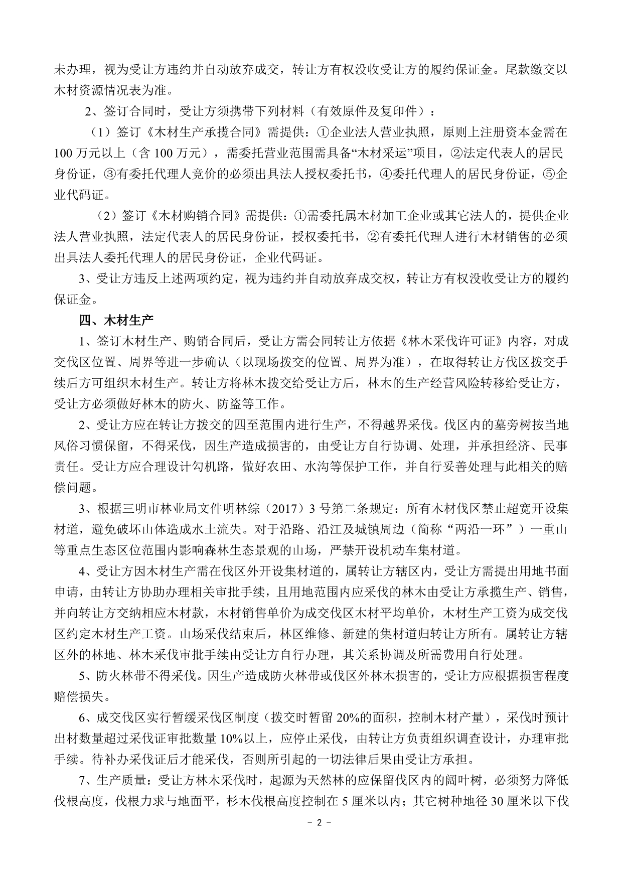 成交確認、價款支付及合同簽訂 | 1 .成交后的兩個工作日內受讓方以微信、郵箱等方式收到《成交通知書》掃描件或電話通知;若受讓方未及時收到成交通知書的,請主動與轉讓方聯系。 2.價款交納日期及方式:成交后,受讓方須于2022年5月3日17:00前將首期木材款(詳見木材資源情況一覽表)及每標生產風險保證金6.5萬元(含木材生產進度、質量保證金3萬元;銷售進度保證金1.5萬元;安全生產保證金2萬元)轉入轉讓方指定銀行賬戶,并與轉讓方簽訂《木材生產承攬合同》和《木材購銷合同》。尾款交付方式以木材資源情況一覽表為準。 轉讓方指定銀行賬戶如下: 戶名:福建金森林業股份有限公司 開戶銀行:福建將樂成功村鎮銀行股份有限公司 賬號:9031510010010000033058 3.受讓方不依據本公告的要求履約的,視為自動放棄受讓資格,其已交納的交易保證金不予退回,并對交易中心因此造成的損失承擔賠償責任,轉讓方有權將該標的重新組織競買交易。 | ||