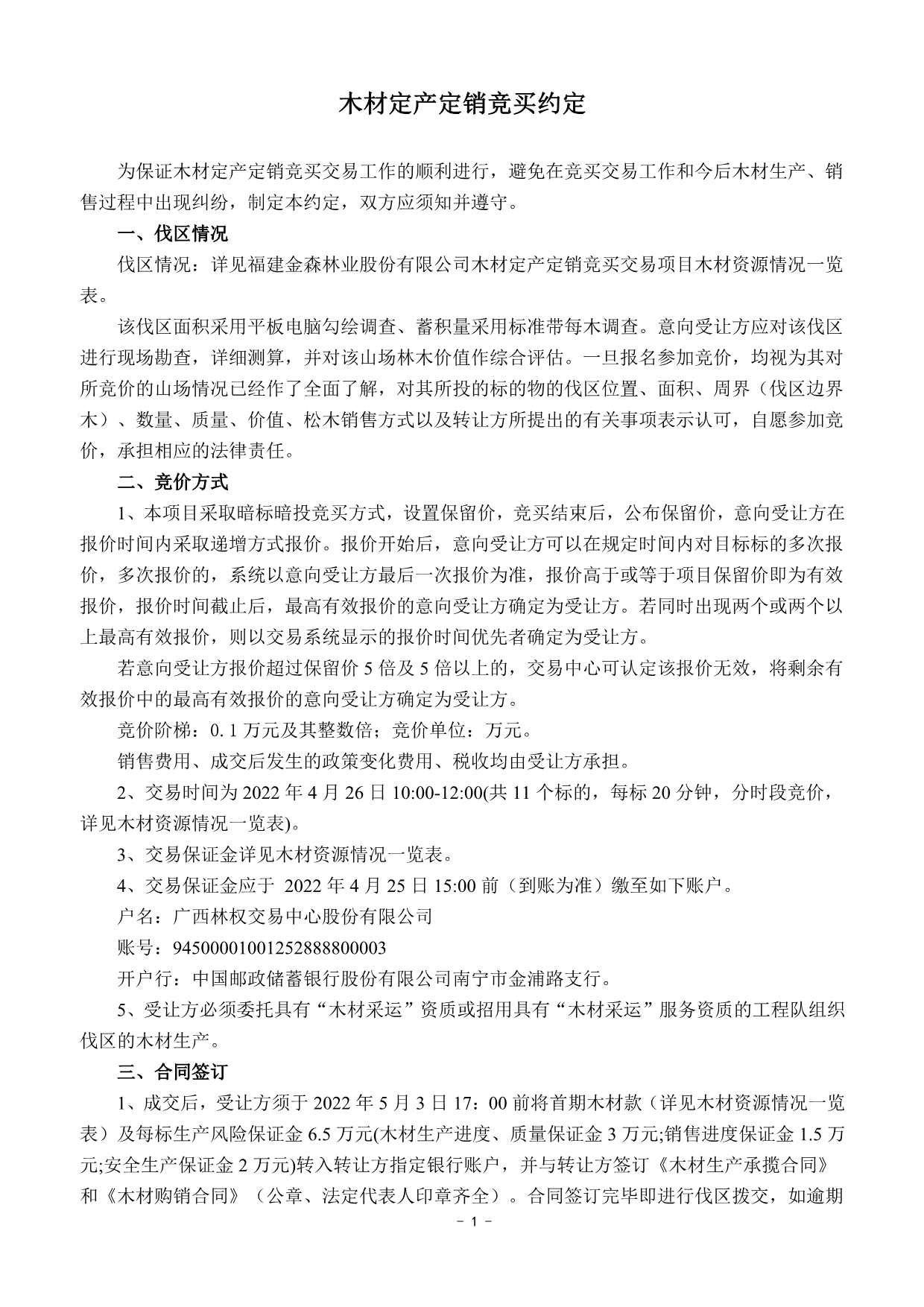 保證金及 處理方式 | 1.須交納的交易保證金詳見木材資源情況一覽表。 2.交易保證金應于2022年4月25日15:00前(到賬為準)繳至如下賬戶: 戶名:廣西林權交易中心股份有限公司 賬號:94500001001252888800003 開戶行:中國郵政儲蓄銀行股份有限公司南寧市金浦路支行 注: ①交易保證金只接受銀行柜臺、網銀、電匯轉賬,不接受ATM轉賬、現金繳款; ②交易保證金轉賬單上須注明參與競拍哪一標的保證金 (如:0426金森1標保證金)。 3. 交易成交,在收到交易雙方出具的《款項收訖及正式書面合同簽訂確認函》后的5個工作日內,受讓方已交納的交易保證金由交易中心直接轉到福建金森林業股份有限公司指定銀行賬戶充抵履約保證金。 4.交易成交,受讓方如未按本公告約定與轉讓方簽訂成交文件的,或違反交易中心交易規則的,其已交納的交易保證金將不予返還; 5.未成交者的交易保證金交易中心將在交易結束后次日起3個工作日內全額無息返還。 | ||